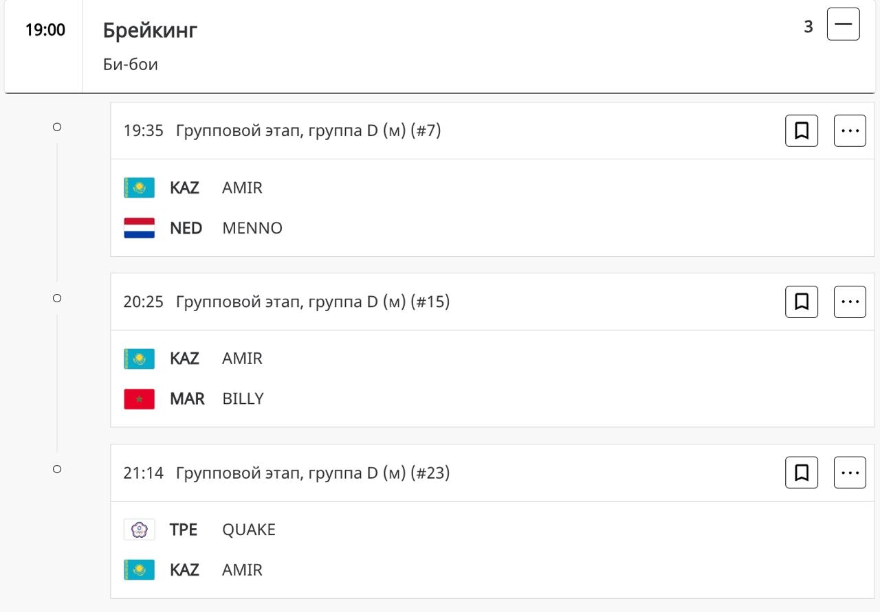 Главным фаворитом мужского брейкинга называется американец Виктор Монтальво. За ним идет канадец Филип Ким и японец Сигэюки Накараи. Амир Закиров только на девятом месте в списке главных претендентов на «золото».