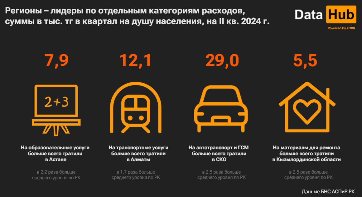 «Во II квартале 2024 года среднедушевые расходы жителей города на услуги по организации досуга и культуры составили 8,6 тысяч тенге, в 2,4 раза превысив средний уровень по РК в целом», - говорится в сообщении.Почти столько же получилось в Карагандинской области (около 8,6 тысяч), а жителей Астаны алматинцы по показателю обошли на четверть: среднедушевой уровень в столице 7 тысяч тенге. А меньше всего на досуг в среднем потратили в области Абай – всего по 916 тенге. Еще наблюдение: алматинцы впереди по тратам не только на развлечения, но и на здоровье. Так, в апреле-июне расходы на услуги в здравоохранении составляли 8,1 тыс. тг на душу населения, что тоже в 2 раза больше среднего по РК. Следом за алматинцами тут идут жители ВКО и Астаны (по 5,5 тыс. тг), ну а меньше остальных на медицину в среднем тратят в Шымкенте (1,7 тыс. тг). Ну а еще пару деталей относительно расходов жителей разных регионов привели на картинке.