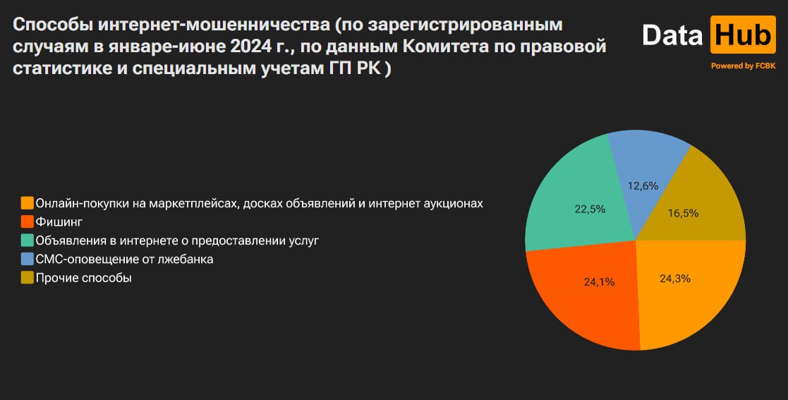 За шесть месяцев 2024 года в стране зарегистрировано 9936 случаев интернет-мошенничества, что на 4,1% больше, чем в том же периоде прошлого, следует из данных Комитета по правовой статистике и специальным учетам ГП РК, сообщает Belles.kz. Почти четверть подобных правонарушений, 2417 случаев, связаны с онлайн-покупками на маркетплейсах, досках объявлений и интернет-аукционах: мошенники берут деньги, но обманывают с товаром. Почти не отстает и такой тип мошенничества, как фишинг, «выуживание» ваших конфиденциальных данных (2393 эпизода), говорится в отчете Первого кредитного бюро. Кстати, из регионов больше всего случаев интернет-мошенничества в Астане (2204 случая), а на втором месте – Алматы (1048 случаев).Если оценивать уровень правонарушений в расчете на 10 тыс. населения, то впереди опять столица (около 15 эпизодов в полугодие), а за ней Павлодарская область (около 9 эпизодов). Стоит отметить, что речь именно о зарегистрированных фактах – те случаи, о которых пострадавшие не сообщали, в статистику не попадают.