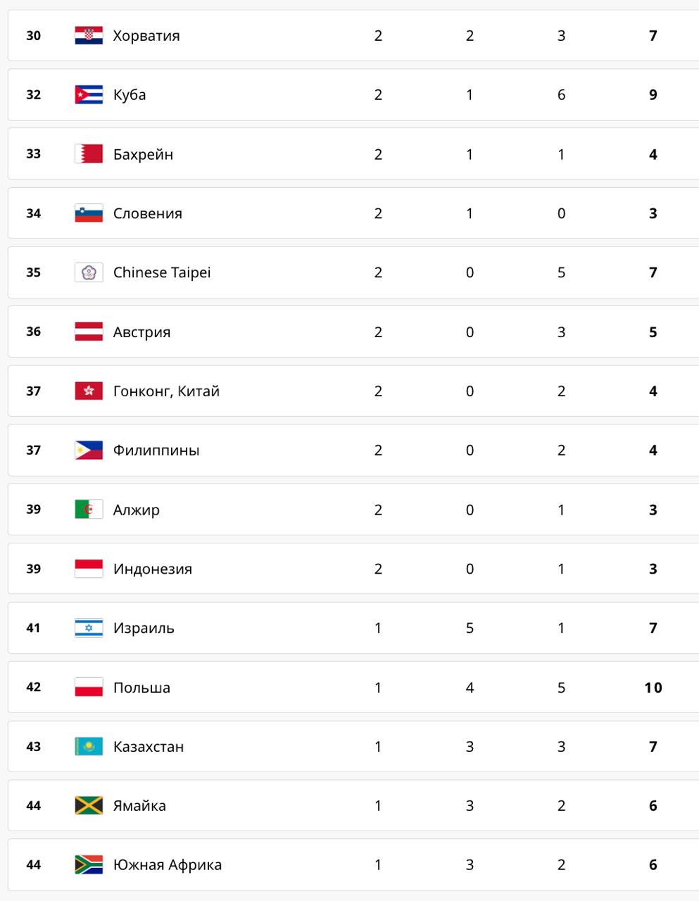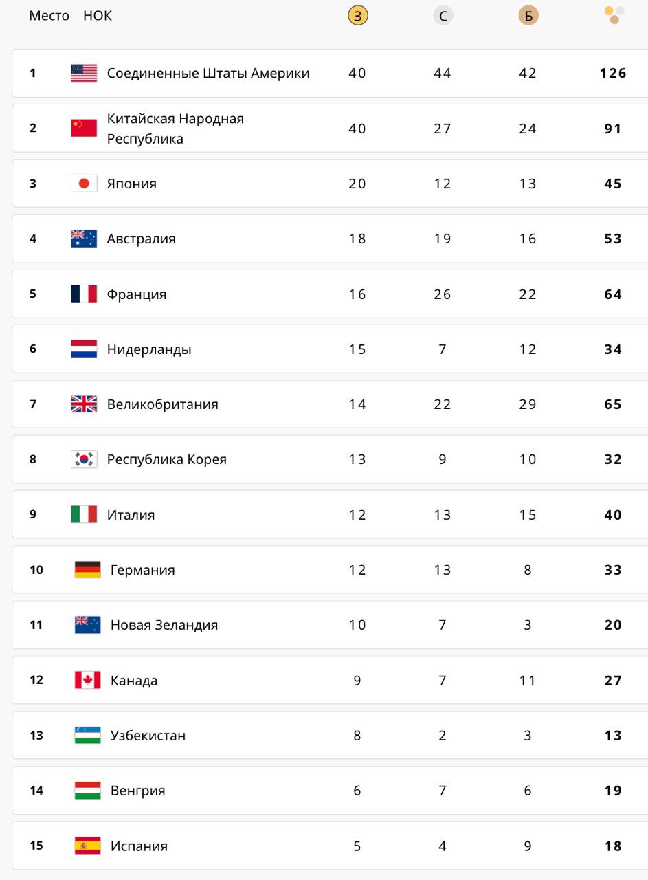 Третьей стала Япония, которая в последний день сместила Австралию на четвертое место. Хозяева Олимпиады-2024 - Франция финишировала пятой. Узбекистан закончил Олимпиаду 13-м, лучший из бывших стран СССР.