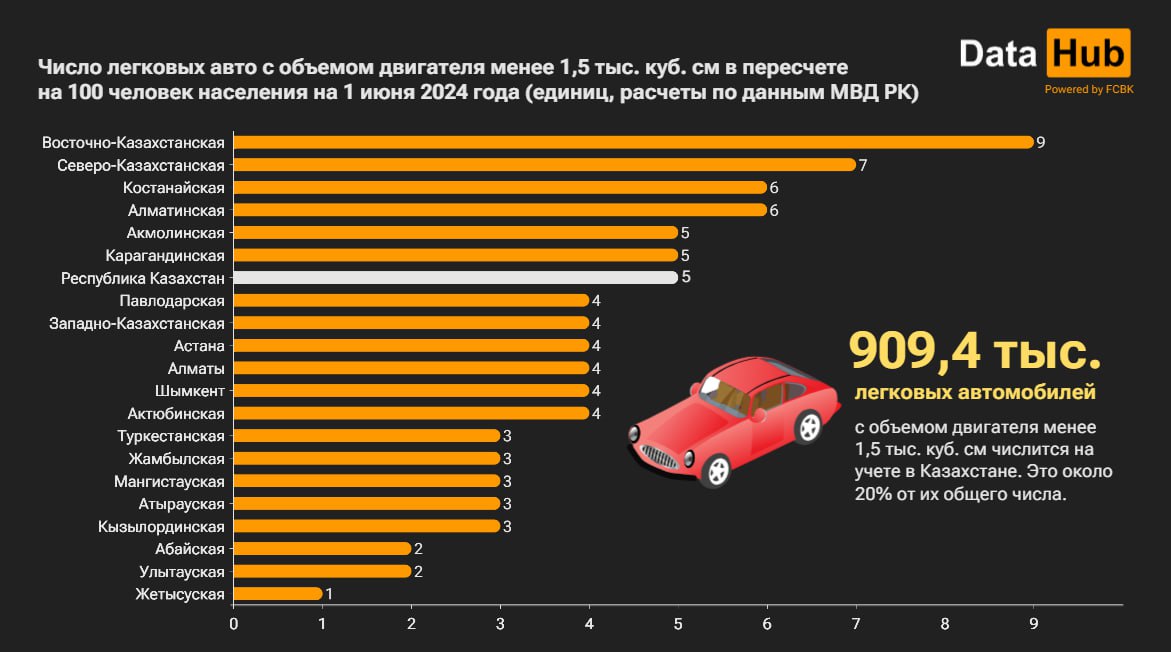 20% парка легковых авто Казахстана приходится на машины с объемом двигателя <1,5 тыс. куб. см (условные малолитражки) – 909,4 тыс. ед, сообщает Belles.kz со ссылкой на Первое кредитное бюро. Шансы увидеть такую машину на дороге равняются 1 к 5. Не так уж и редко, правда? Наиболее сильную тягу к малолитражкам питают жители ВКО – на каждые 100 человек тут приходится 9 таких авто. Следом идет СКО – 7 авто. Третье место с одинаковым результатом делят Алматинская и Костанайская области - 6 авто. А вот алматинцы и астанчане владеют малолитражками относительно неохотно. Здесь на каждые 100 человек приходится по 4 таких авто, что ниже среднего уровня. Зато на общем фоне жители обеих столиц явно отличаются гигантоманией - тягой к авто с объемом двигателя >4 тыс. куб. см. Нигде больше в пересчете на 100 человек показатель не дотягивает до 1 авто. Говоря точнее, в  Астане он составляет 1, в Алматы - 1,1.