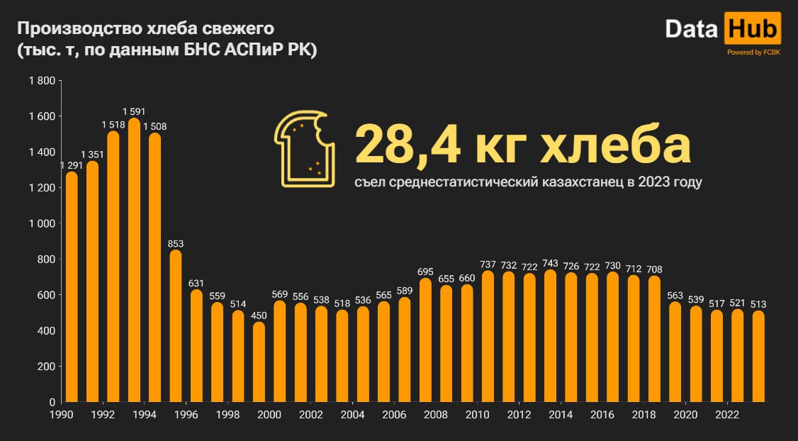 По итогам 2023 года в Казахстане выпекли 513 тысяч тонн хлеба. Это на 8,3 тыс. т меньше по сравнению с годом ранее, а также худшее значение с 1999 годом, сообщает Belles.kz со ссылкой на Первое кредитное бюро. Официальная статистика следит за производством хлеба чуть дольше, чем Казахстан обрел независимость - 34 года. Примечательно, что в самом начале этого периода оно держалось выше 1,5 млн тонн. Однако уже к концу 90-х обвалилось до 450,3 тысяч. Следующие 14 лет показатель плавно рос, пока не достиг отметки 742,5 тысяч. С тех пор он снова сокращается. Так, по сравнению с 2013 годом снижение составило 229,5 тысяч тонн. Почему производство хлеба падает? Подобная тенденция отчасти может быть обусловлена ослаблением спроса. Если 10 лет назад среднестатистический казахстанец съедал 45,3 кг хлеба в год, то сейчас – 28,4 кг. И еще один штрих. В 2023 году мощности предприятий, специализирующихся на выпекании хлеба, были использованы лишь на 38%.