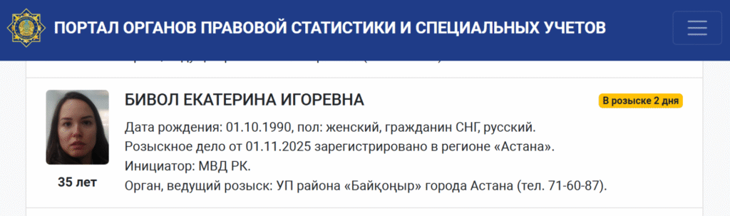 Согласно данным портала, розыскное дело на Екатерину Игоревну Бивол, 1990 года рождения, зарегистрировано 1 ноября в Астане.